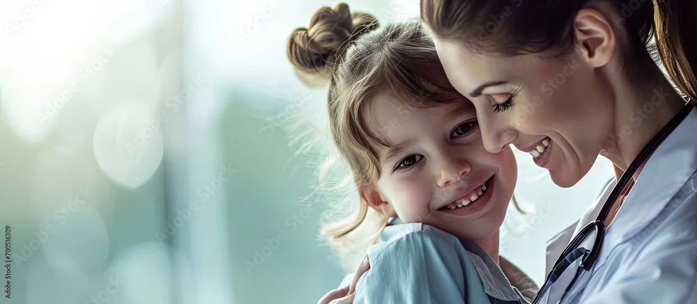 Friendly doctor examining little child Professional neurologist uses hammer to check knee reflex of happy school boy sitting on medical couch in exam room ...