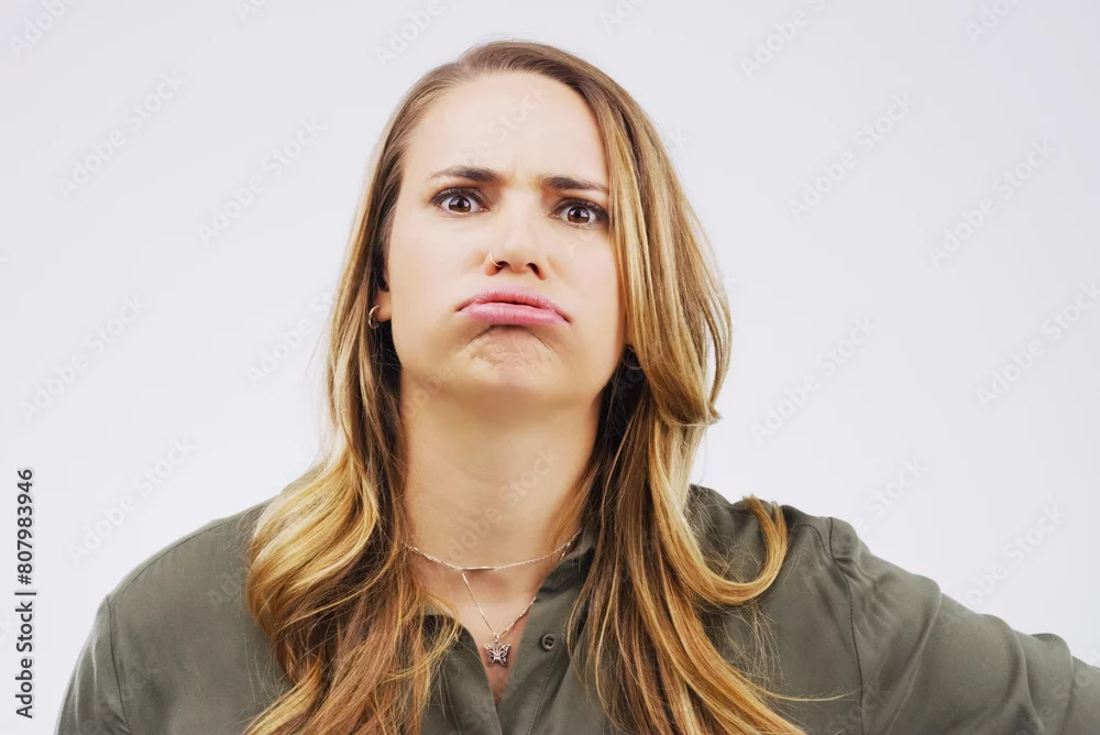 Funny face, woman and portrait in studio for annoyed, humor and silly on white background. Female person, reaction and comic expression in Canada for frown, ...