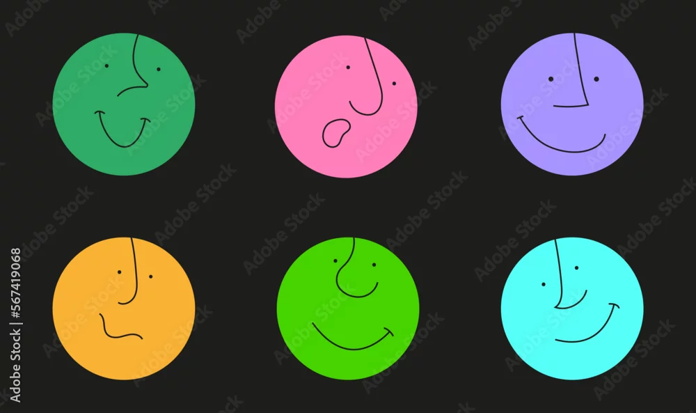 Funny round faces icon set vector in cartoon style. Colorful circle grimace character
