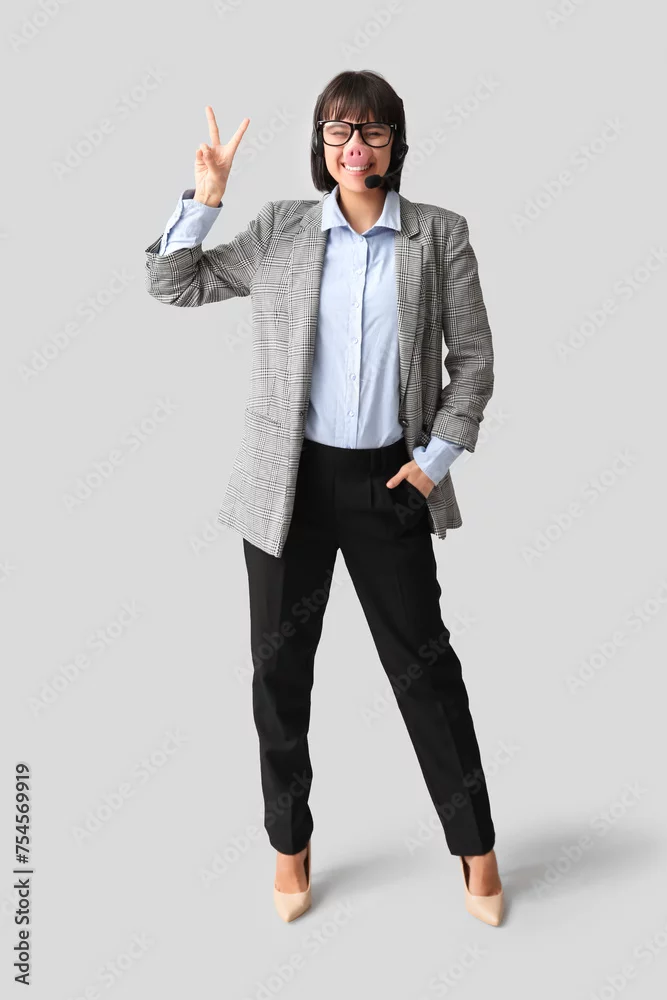 Funny young female technical support worker with headset and pig nose showing victory gesture on grey background. Fool's day