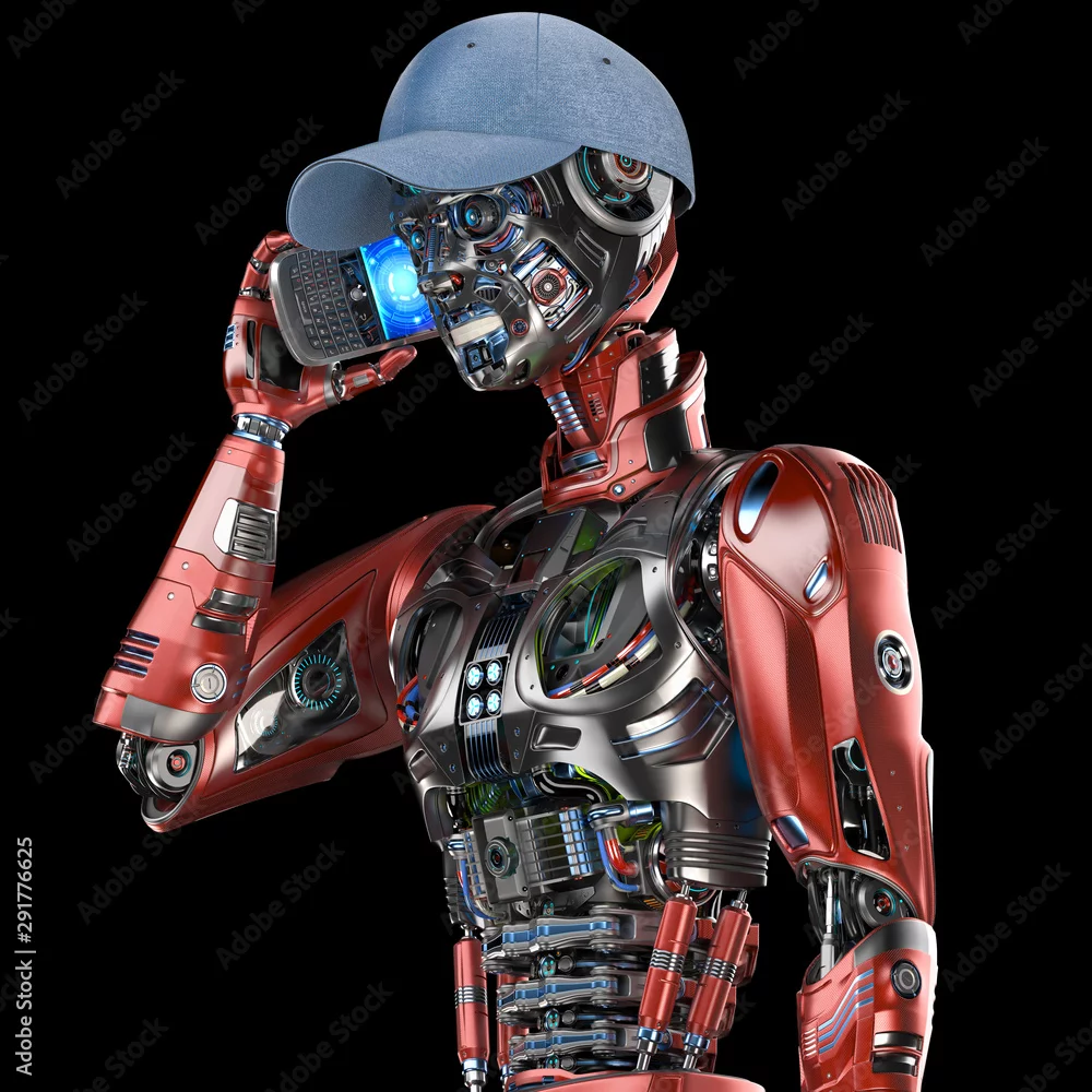 Futuristic android man or very detailed robot talks with somebody using his mobile phone like a human. Upper body isolated on black background. 3d re ...