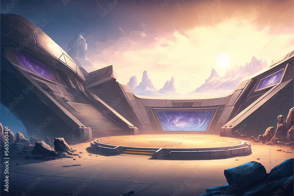 Futuristic Arena background illustration for game design. Abstract background with futuristic sci fi empty stage. alien planet. Futuristic view of an opened ...