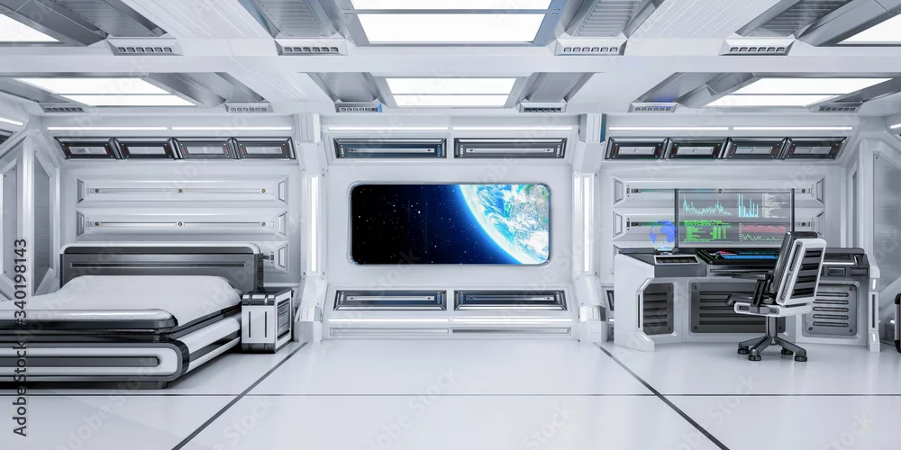 Futuristic Science Fiction Bedroom Interior with Planet Earth View in Space Station, 3D Rendering