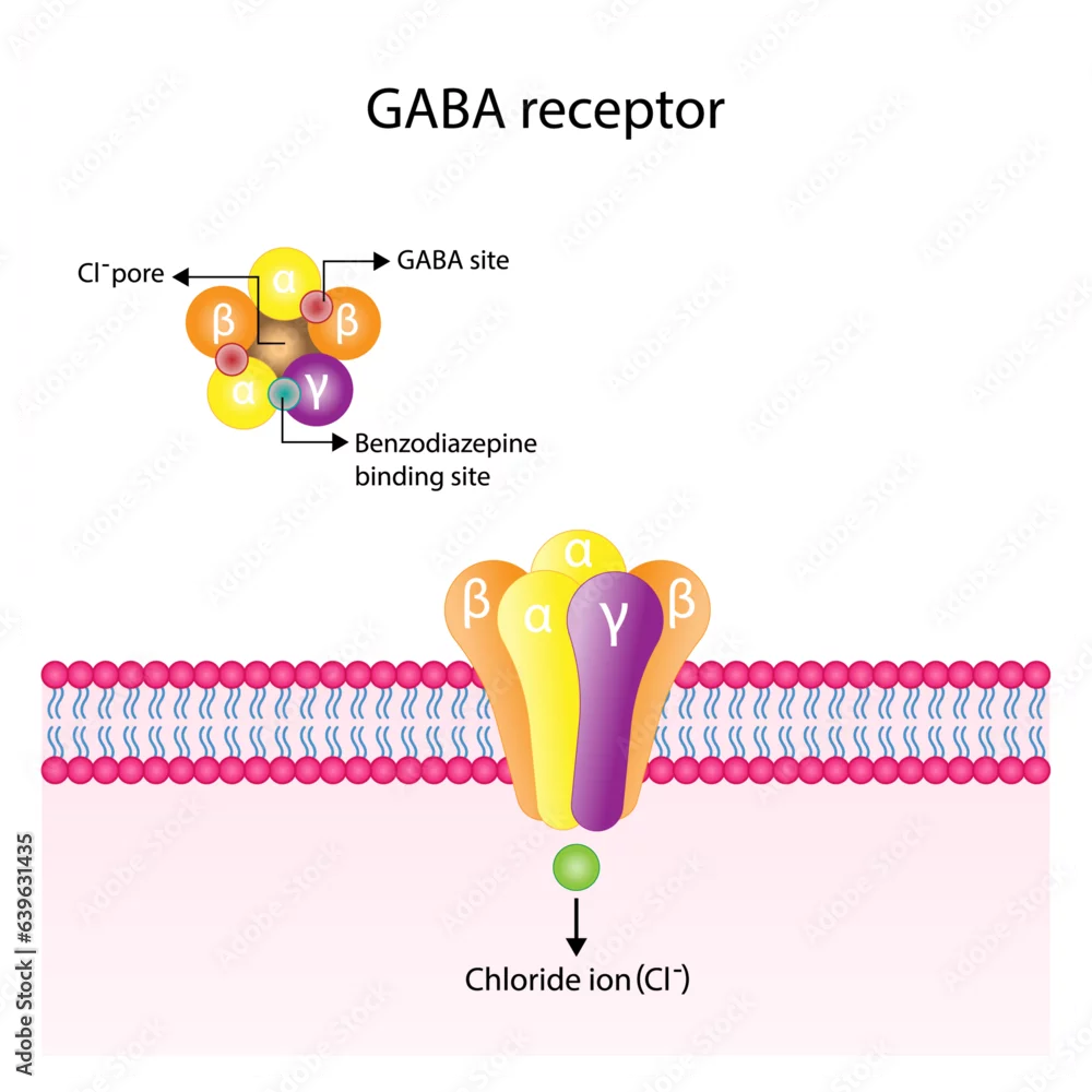 GABA receptor structure, cell membrane. Neurotransmitter gamma-aminobutyric acid, GABA A and GABA B. Top view of ion channel, the five combined subunits, forming Cl ion channel pore. Vector design.