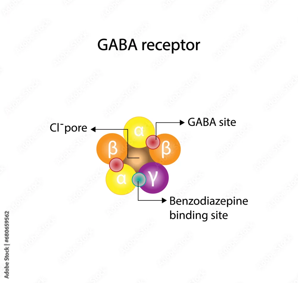 GABA receptor structure, cell membrane. Neurotransmitter gamma-aminobutyric acid, GABA A and GABA B. Top view of ion channel, the five combined subunits, forming Cl ion channel pore. Vector design.