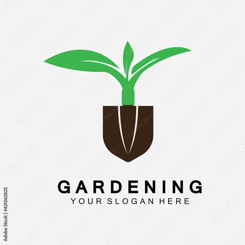 Gardening logo with shovel icon and tree with green leaves logo template.