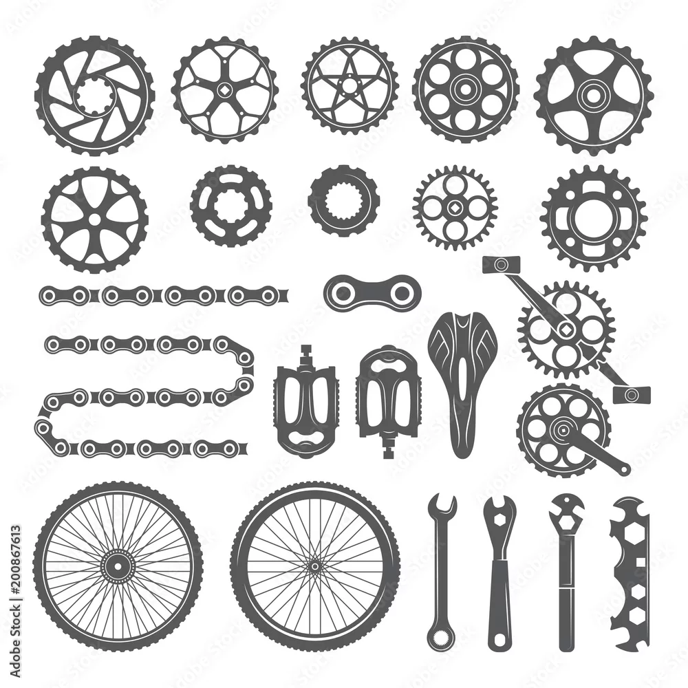 Gears, chains, wheels and other different parts of bicycle