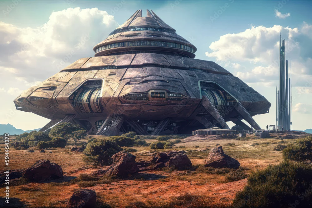 Geometric science fiction alien architecture, exterior building design, concept art. Generative AI