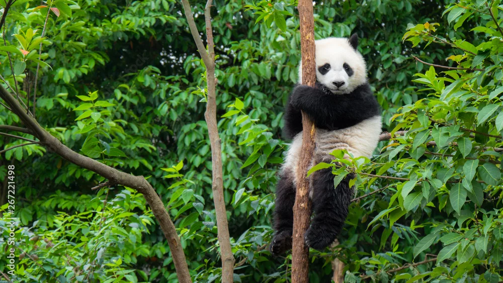 Giant Panda bear baby cub sitting in tree in China