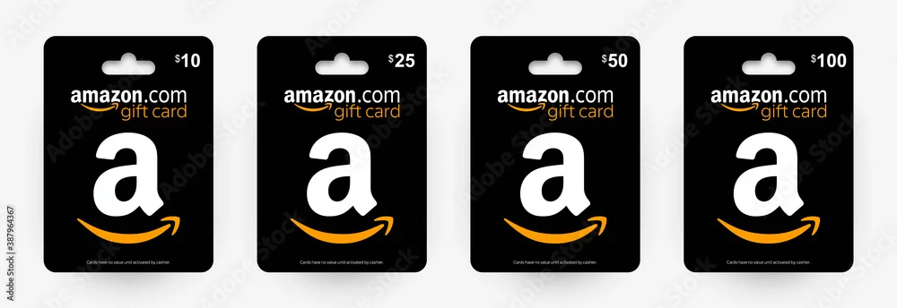 Gift card Amazon 10$, 25$, 50$, 100$. Black Amazon gift card with shadow isolated on light background. Vector illustration EPS10