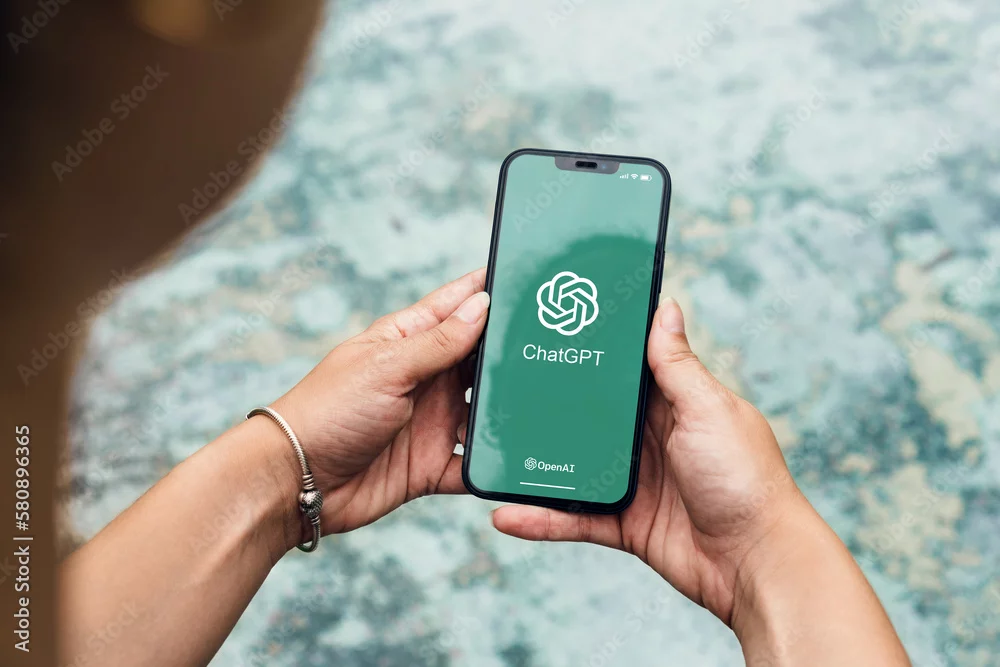 Girl in the park holding a smartphone with ChatGPT artificial intelligence chatbot app on the screen. Green area and an artificial lake. Rio de Janeiro, RJ, Brazil. March 2023