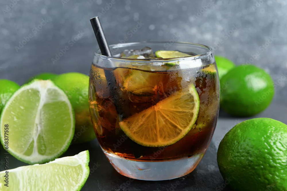 Glass of cold Cuba Libre cocktail on grey background