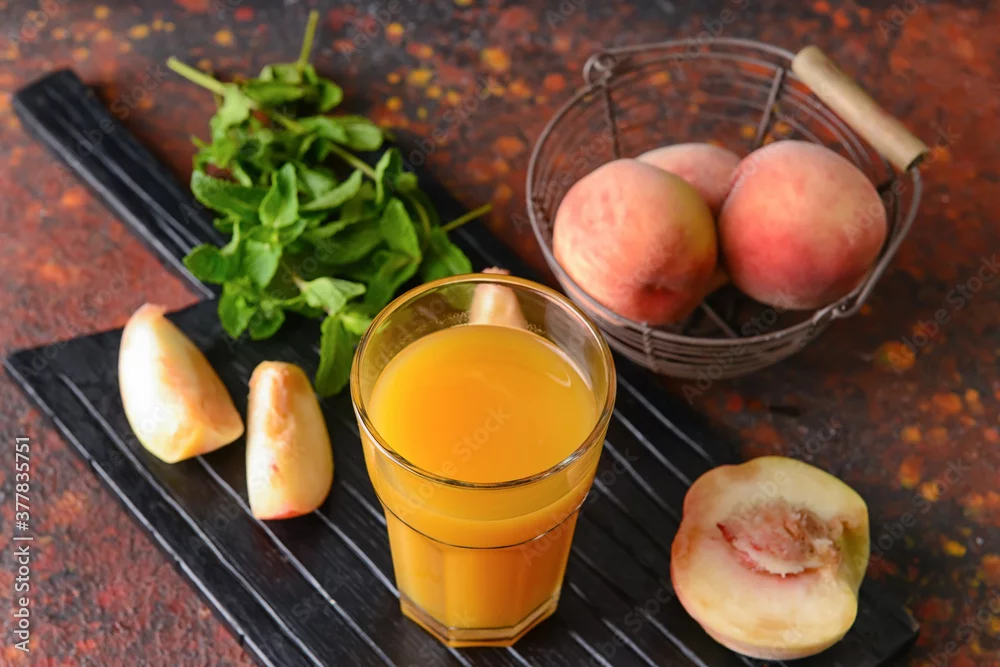 Glass of fresh peach juice on table