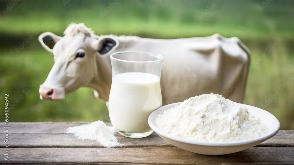 Glass of milk and colostrum supplement powder on a table on background green field with cow. Natural and wholesome nature of the products