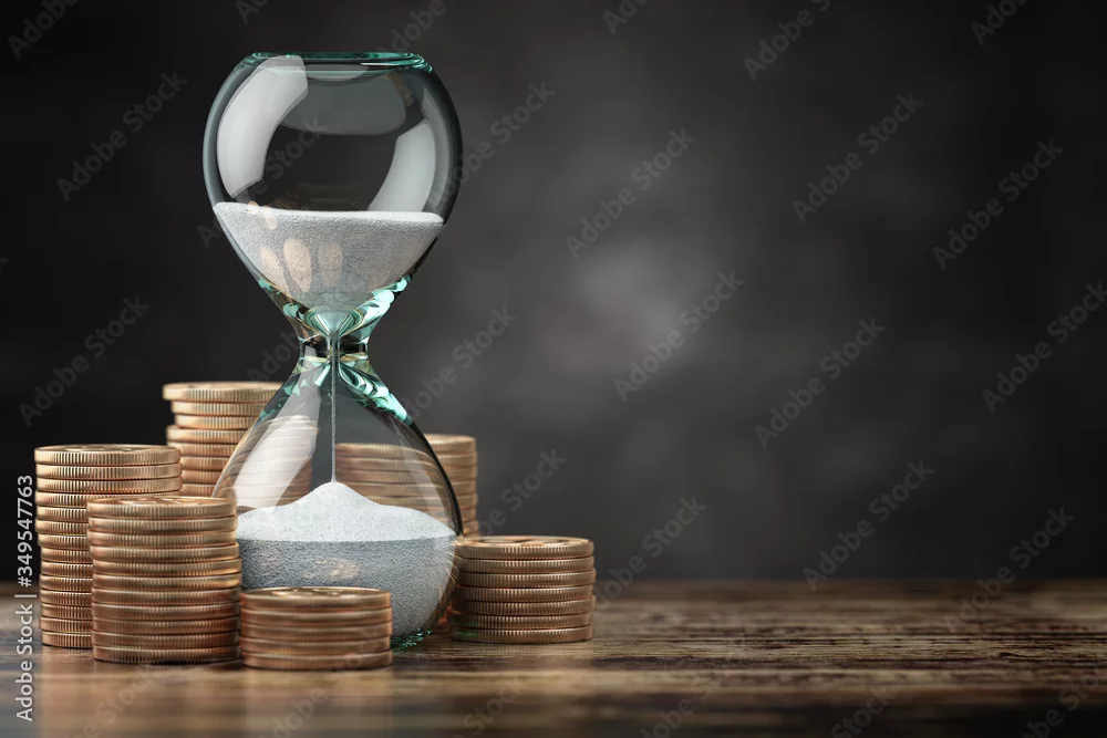 Golden coins and hourglass clock. Return on investment, deposit, growth of income and savings, time is money concept.