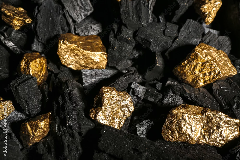Golden nuggets on black charcoal, closeup