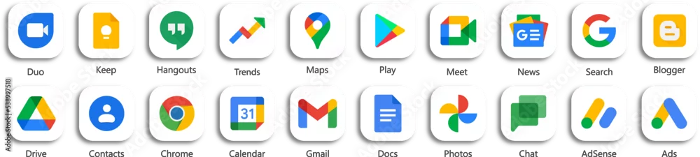Google icons set. Google product icon on transparent background with realistic shadow. Google, Gmail, Google Pay, Calendar, Duo, Keep, Hangouts, Trends, Maps, Play, Appointments, News, Search. PNG ima