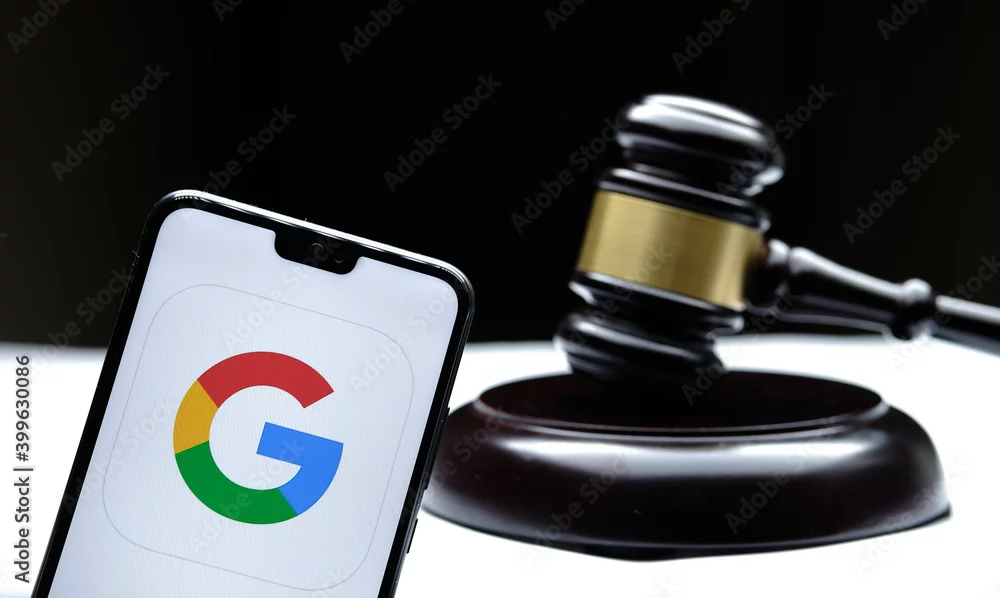 Google logo seen on the smartphone placed next to the judges gavel. Concept for a lawsuit, legal case, antitrust and fine. Real photo, not a montage. Stafford, United Kingdom - December 15 2020.