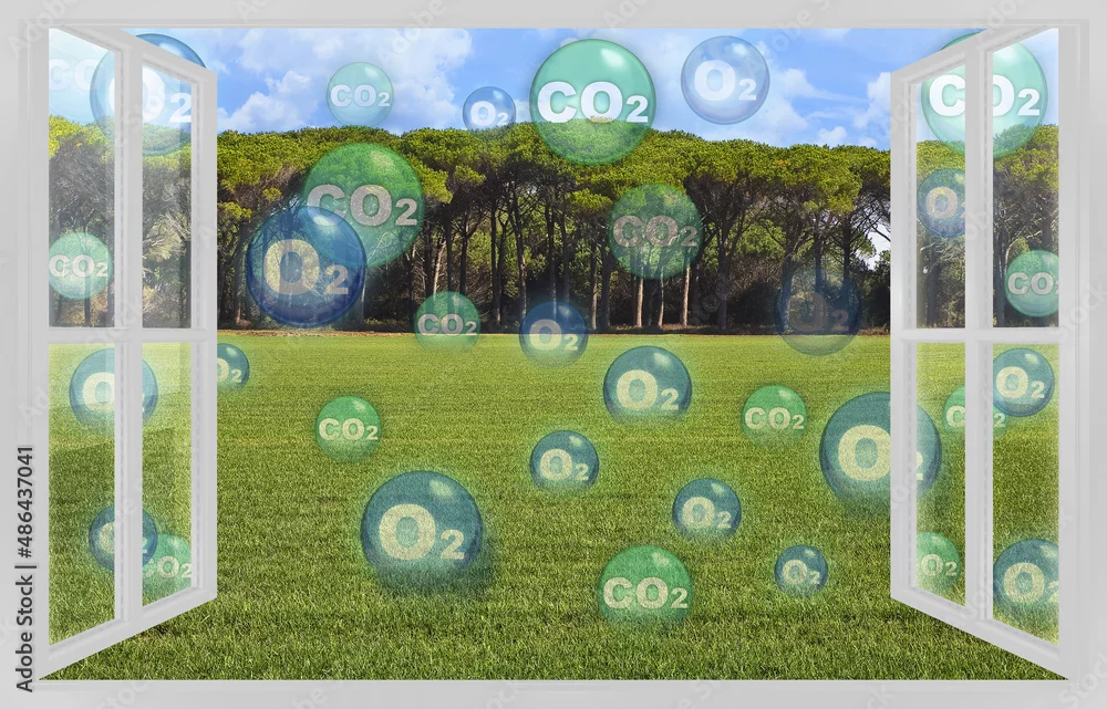 Grass absorbs carbon dioxide the same way trees do, but on a smaller scale - concept with a grassy area that absorbs CO2 carbon dioxide molecules and releases O2 oxygen molecules seen through a window
