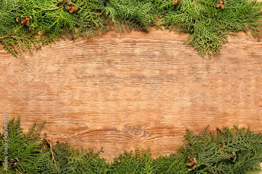 Green coniferous branches on wooden background
