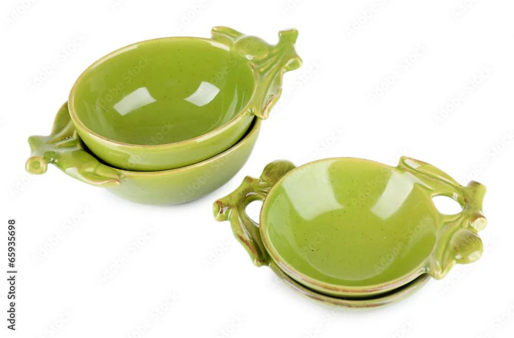 Green empty bowls for olive oil and olives isolated on white