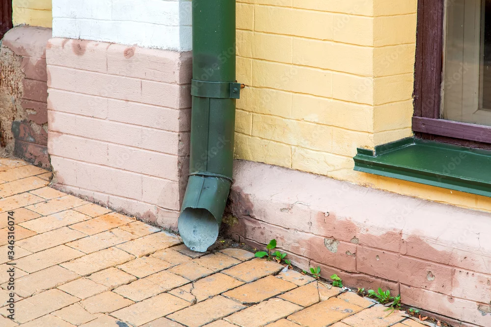 green rain pipe rain system on the facade of the brick house near the stone sidewalk, close up of an architectural element.