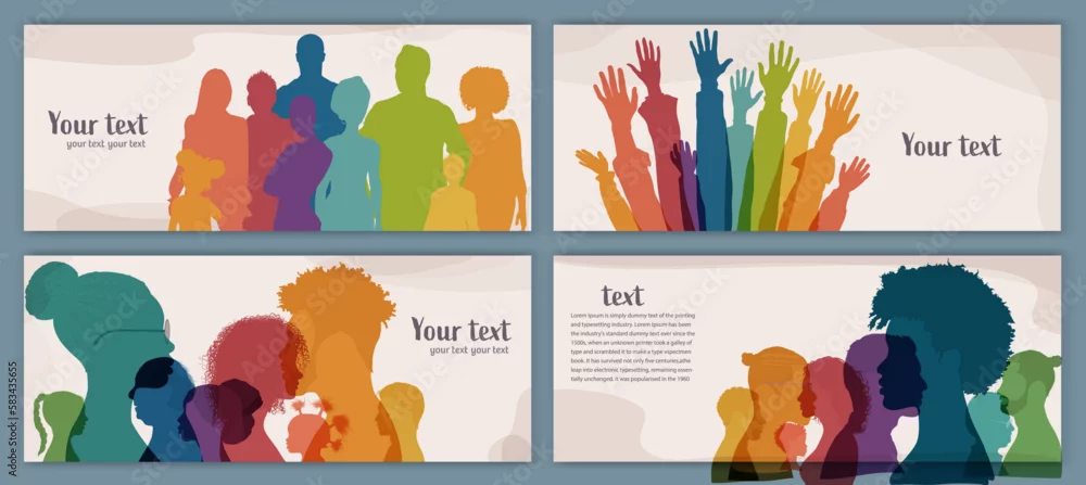 Group people diversity. Silhouette of men women children teenagers elderly. Various people of different ages. Poster template banner cover page. Different cultures. Racial equality concept