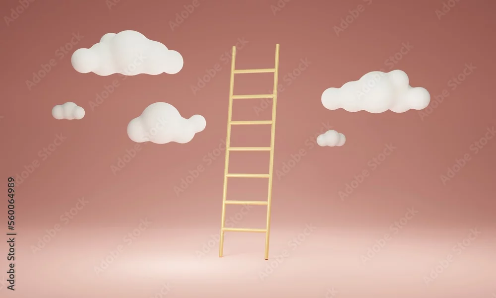 Growth ladder concept, 3D illustration. Minimalistic ladder symbolizing the climb to success and upward progress. Each step represents the opportunities and challenges on the path to self-improvement.