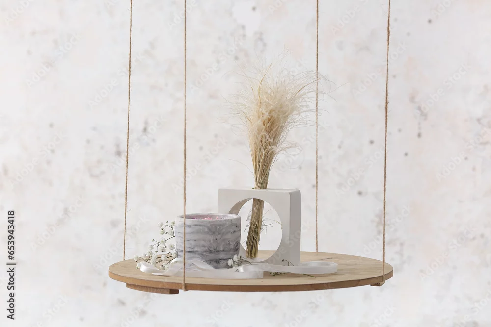 Gypsophila flowers, pampas grass and candle on hanging shelf near light wall in room
