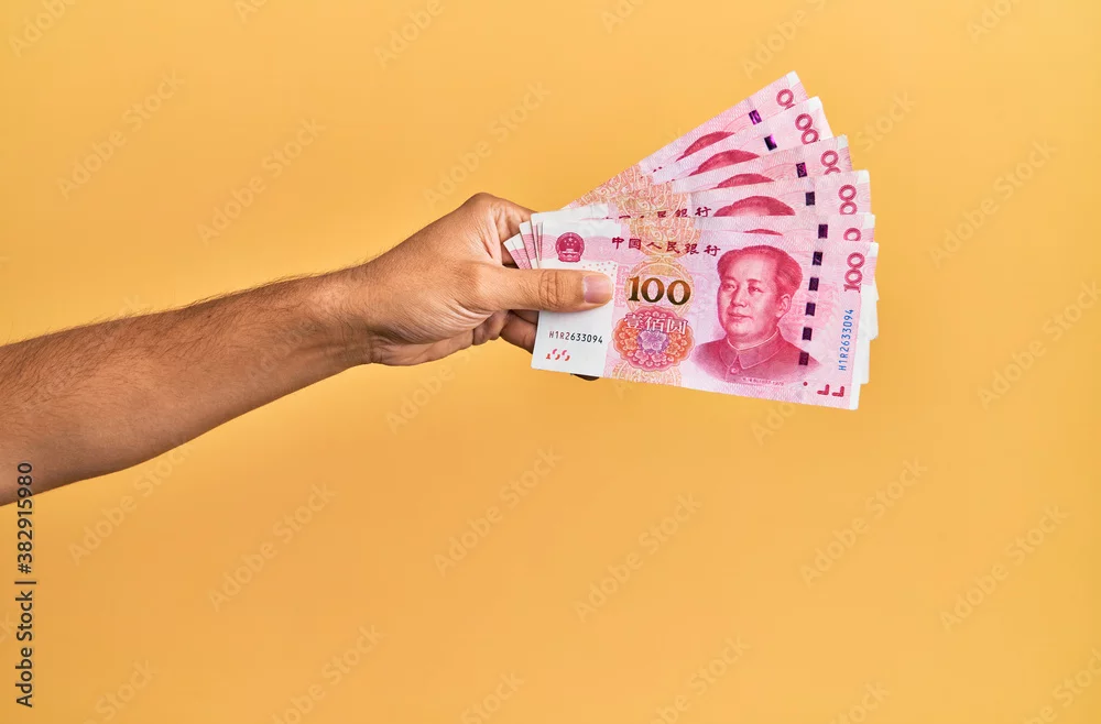 Hand of hispanic man holding chinese 100 yuan banknotes over isolated yellow background.