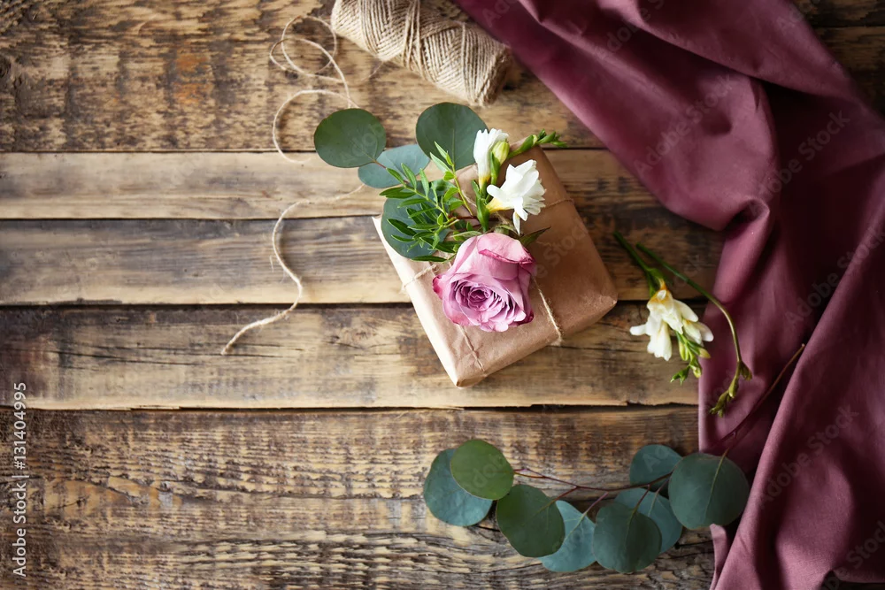 Handcrafted gift box with flowers on wooden table