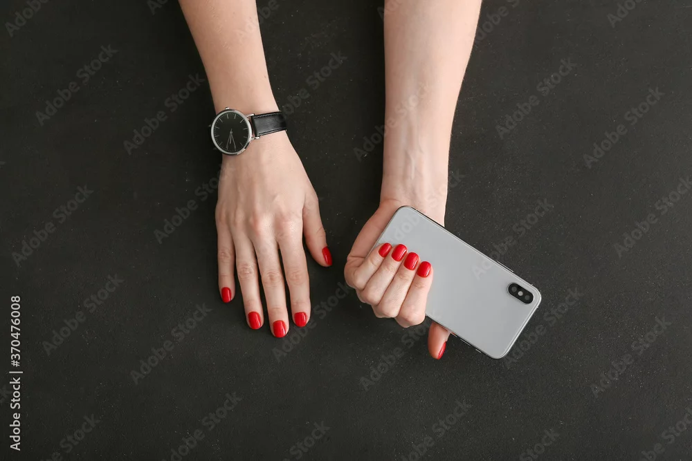 Hands with beautiful manicure and mobile phone on dark background
