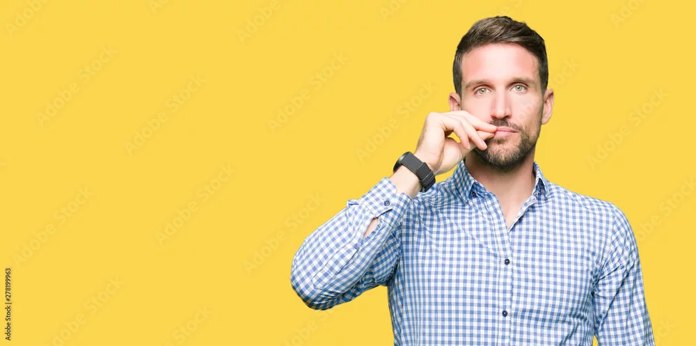 Handsome business man with blue eyes mouth and lips shut as zip with fingers. Secret and silent, taboo talking