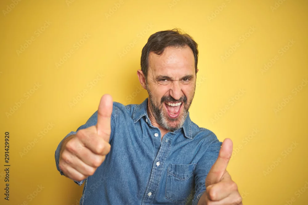 Handsome middle age senior man with grey hair over isolated yellow background approving doing positive gesture with hand, thumbs up smiling and happy for success. Winner gesture.
