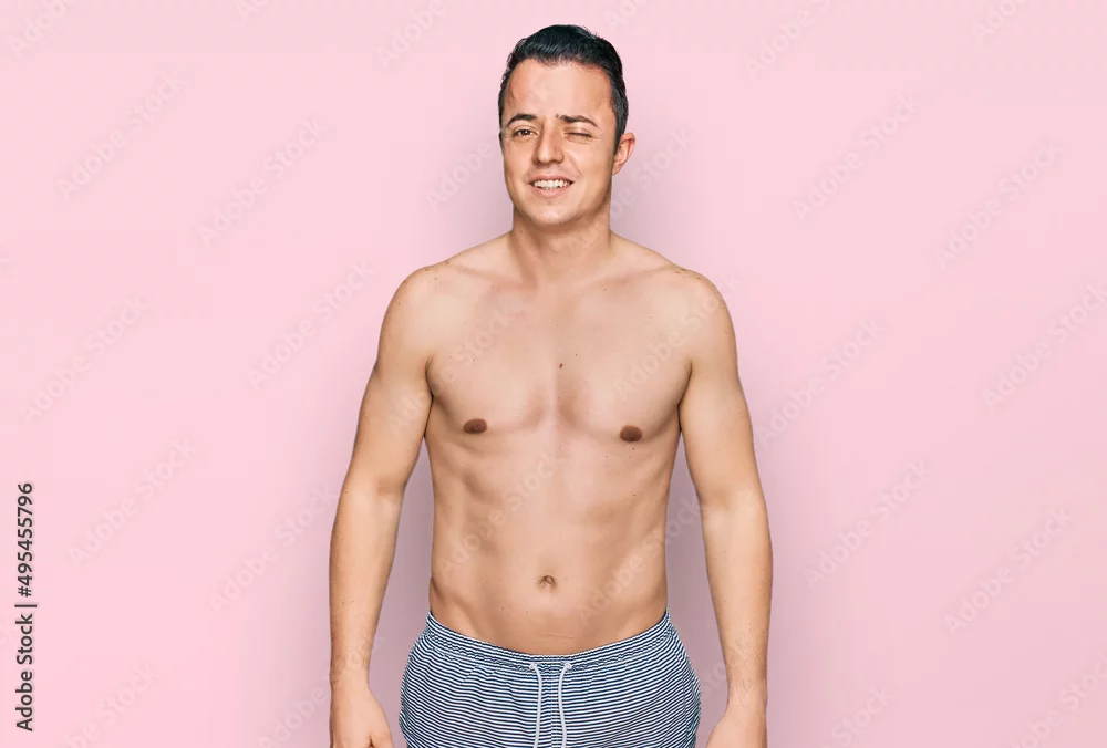 Handsome young man wearing swimwear shirtless winking looking at the camera with sexy expression, cheerful and happy face.