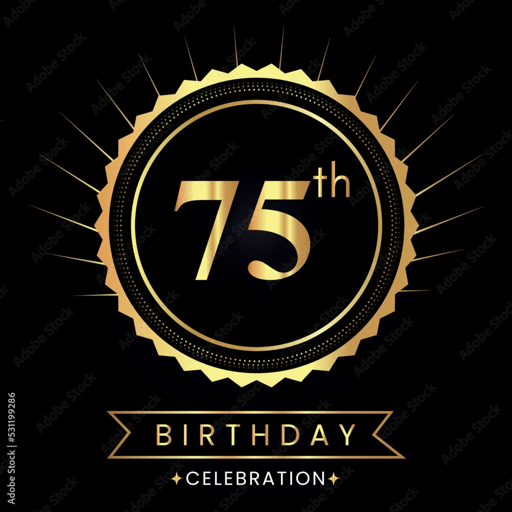 Happy 75th birthday with gold badges isolated on black background. Premium design for poster, banner, birthday card, greeting card, birthday celebrations, ...