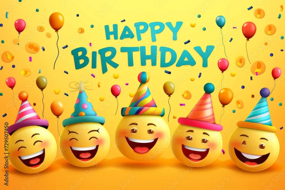 Happy Birthday with emojis with many balloons and confetti Generative AI