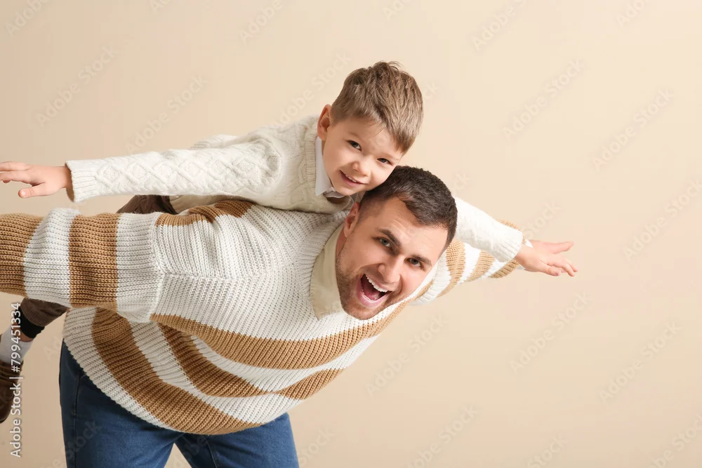 Happy father and his little son having fun together on beige background