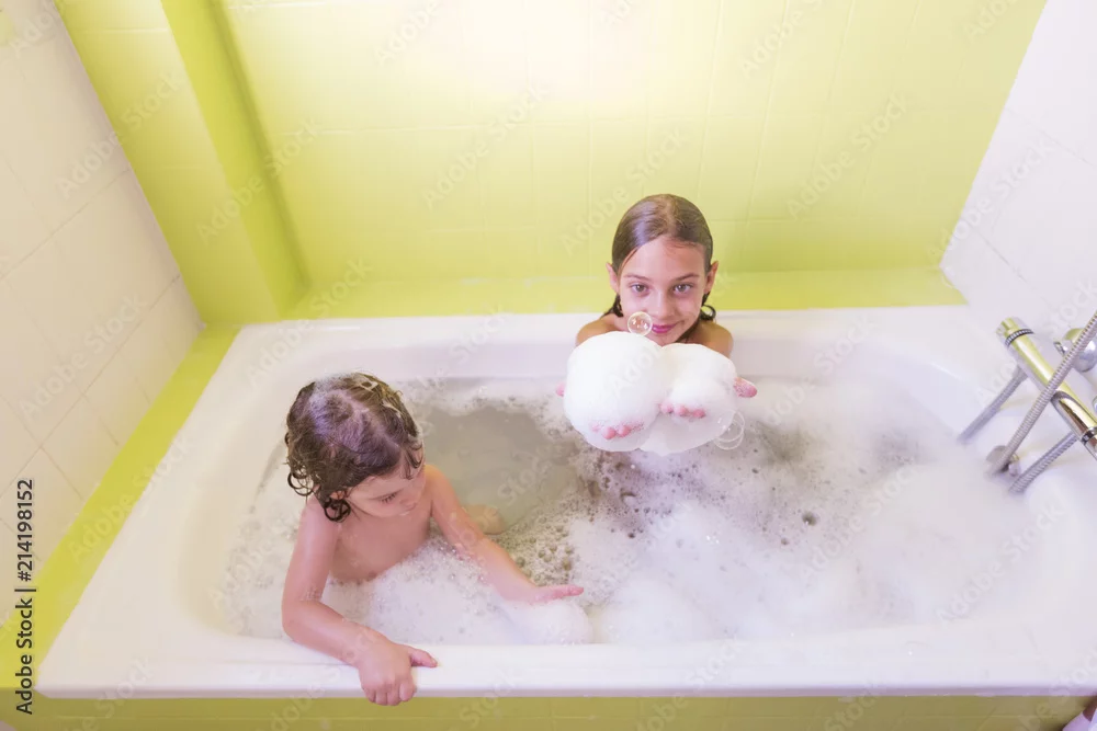 Happy laughing sister kids taking a bath playing with foam bubbles. Little children in a bathtub. Family lifestyle indoors