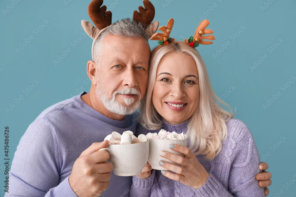 Happy mature couple with hot chocolate on color background