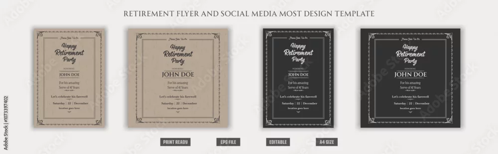 Happy Retirement flyer, social media post, vintage, congratulations, celebrate, vector, editable, posh, classic, old, elder citizen, traditional, a4 template bundles.