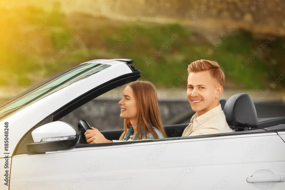 Happy young couple in car on road trip