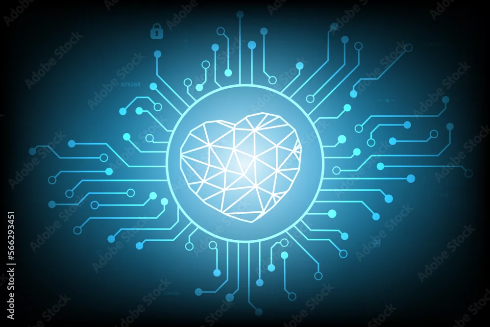 Heart vector glow in the circuit board cyber security on dark blue vintage screen with log to scan password login system design for greeting card technology ...