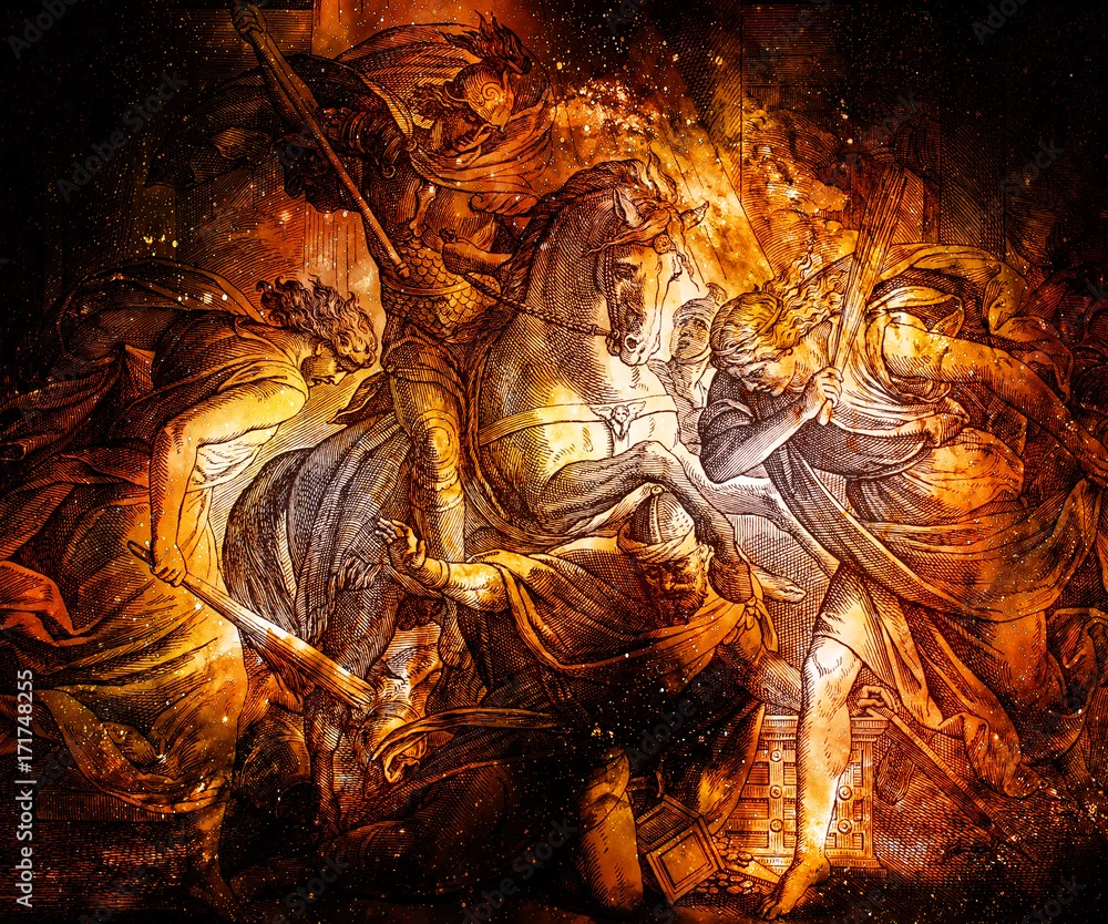 heliodor fighting on a horse, graphic collage from engraving of Nazareene School, published in The Holy Bible, St.Vojtech Publishing, Trnava, Slovakia, ...