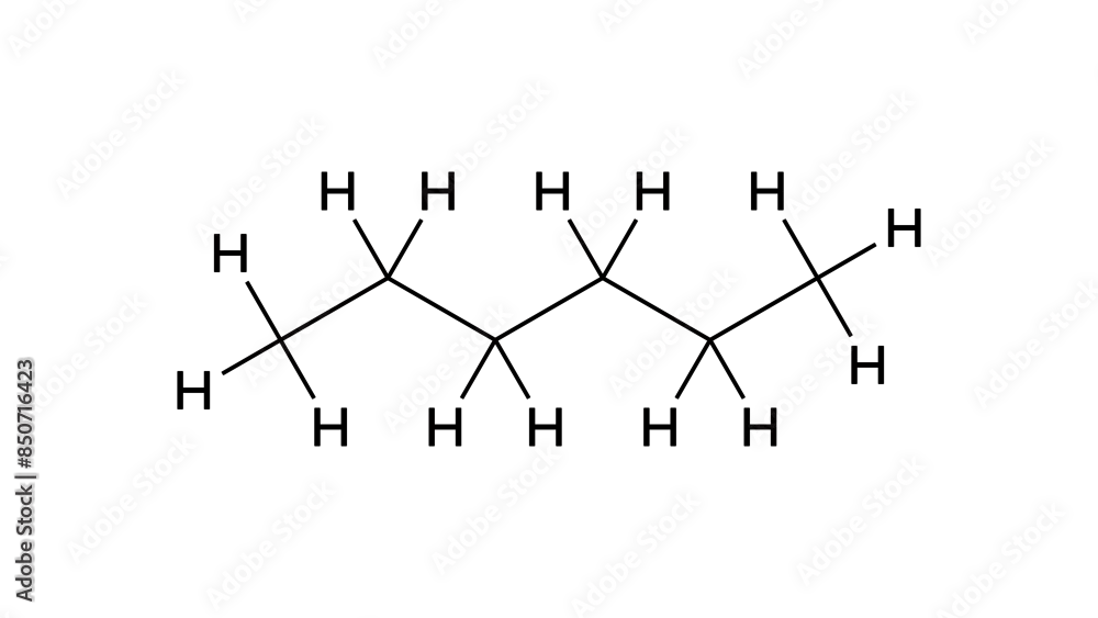 hexane molecule, structural chemical formula, ball-and-stick model, isolated image n-hexane