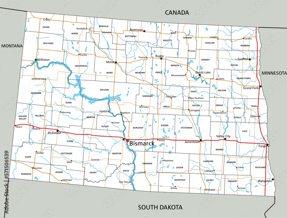 High detailed North Dakota road map with labeling.