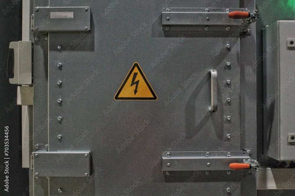 High voltage sign on the wall of a gate power plant. Industrial safety warning sign. Electricity switching station. Metal gray doors of transformer box electrical substation
