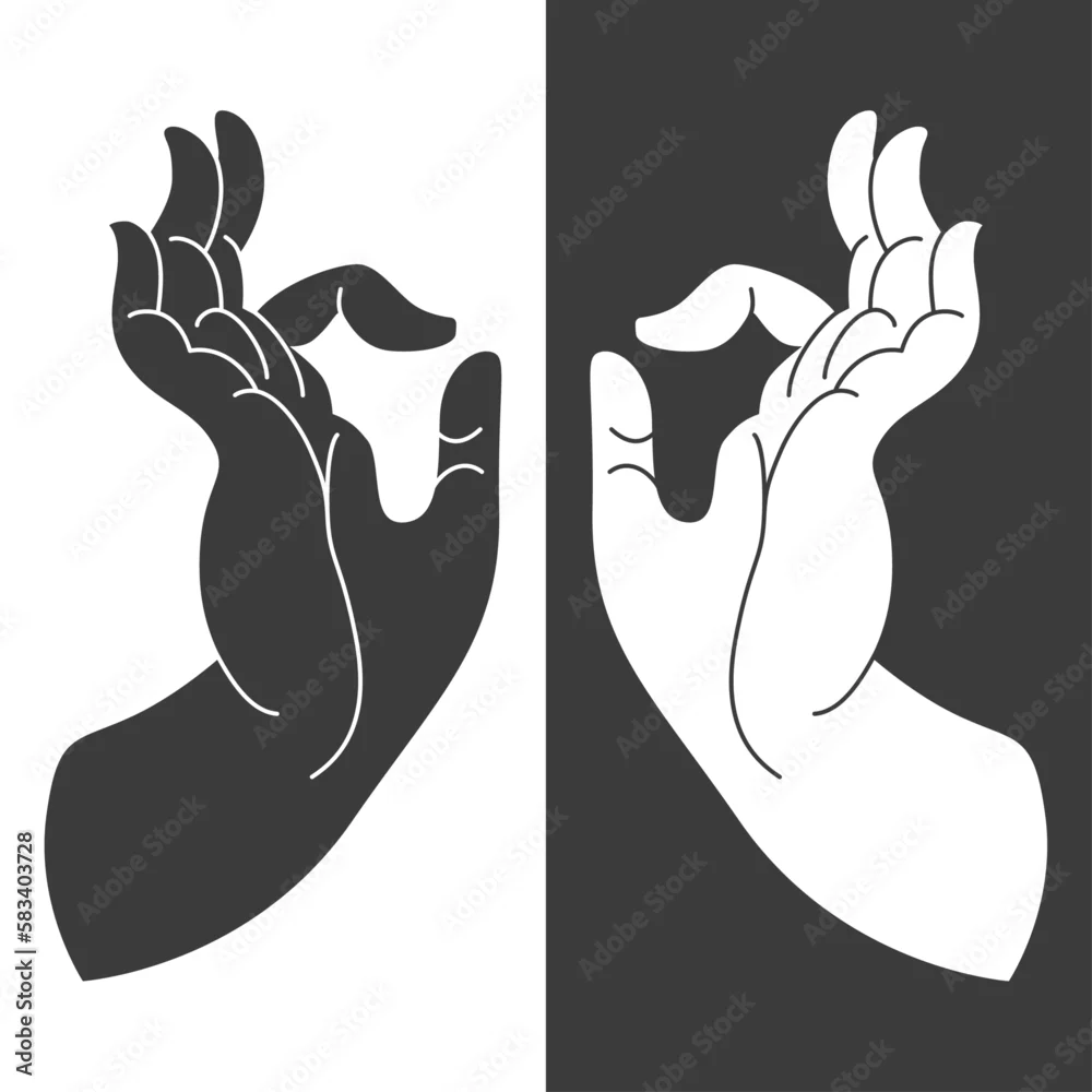 Hindu hand pose on black and white. Buddhist mudra. Tibetan thangka symbol.