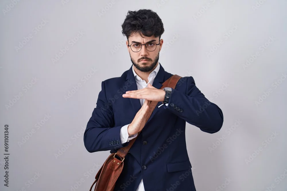 Hispanic man with beard wearing business clothes doing time out gesture with hands, frustrated and serious face