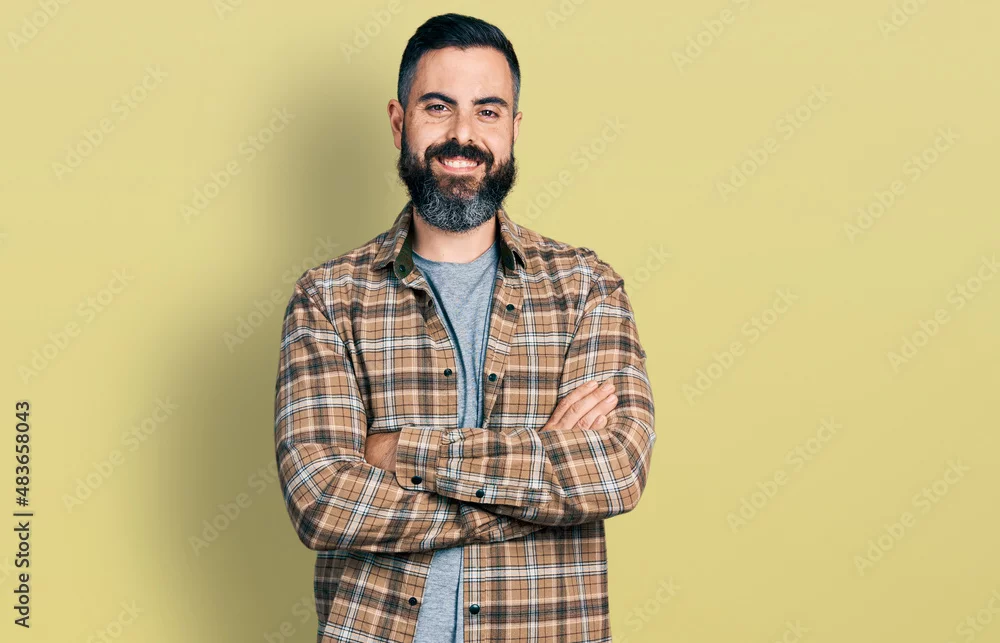 Hispanic man with beard with arms crossed gesture smiling with a happy and cool smile on face. showing teeth.